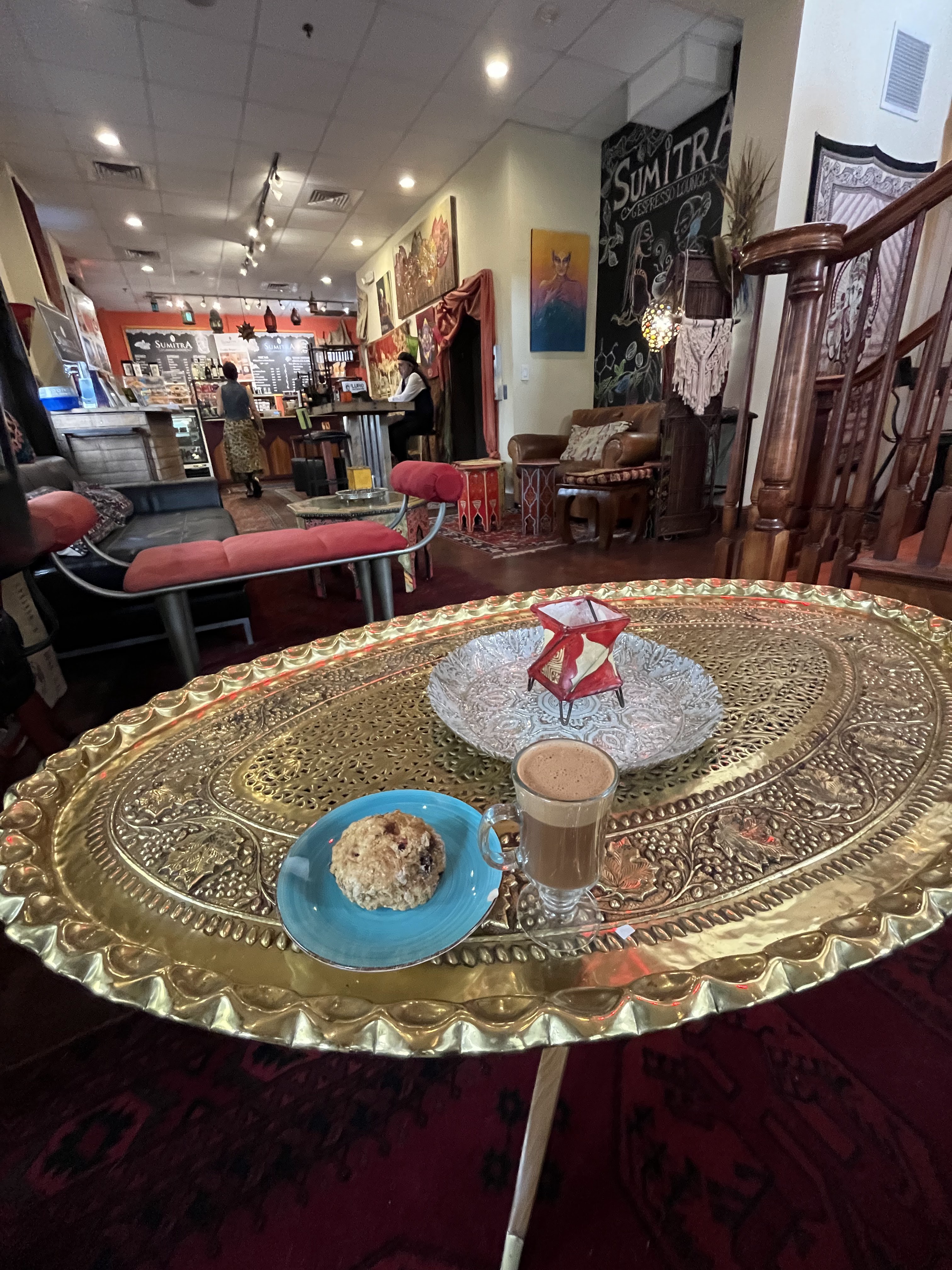 I visited a coffee and wine lounge I’ve been to several times before: Sumitra Espresso Lounge. I always love the shop’s ambiance and haven’t had a bad drink there, either. I’m an abysmal photographer, so you’ll have to take my word for the coziness of its vaguely… Turkic?… Interior, that boasts a lot of gold, rich red and orange hues, and polished, dark wood. Like most coffee shops, bossa nova music plays gently in the background. There was a small collection of eclectic books in the window to peruse while eating and drinking. I’d brought my own book, though, so that’s what I read as I drank my drinking chocolate (which is kind of like a rich, not overly sweet latte, but sans coffee) and ate my white chocolate and cranberry scone.
